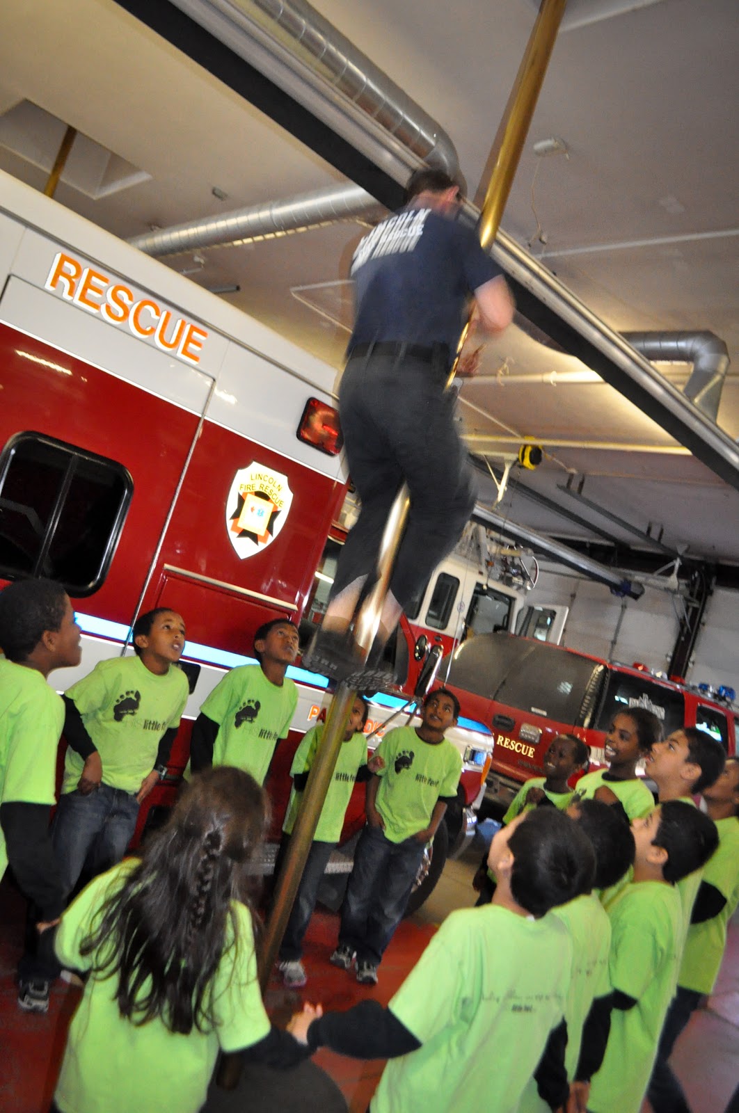 Day 126: The children watching an American fireman slide down a fire pole at the Lincoln Fire Department, Station #1 (Lincoln, NE)