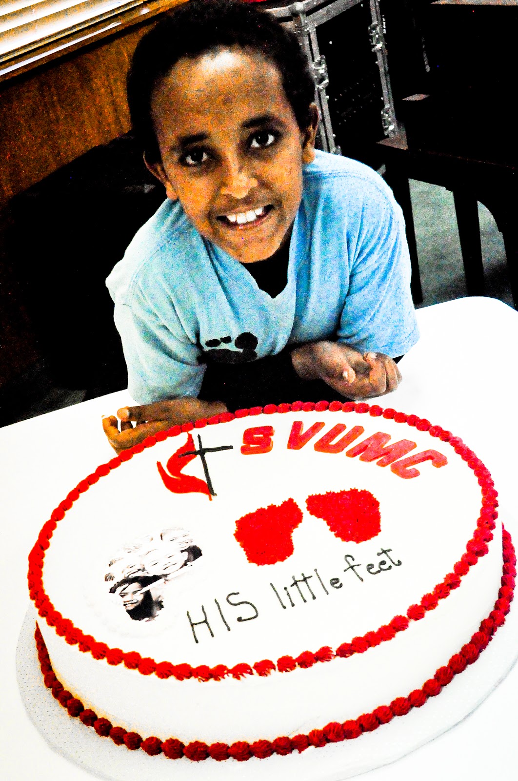 Day 130: A beautiful His Little Feet cake at Spring Valley UMC in Dallas, TX. Nahagi really wanted a picture with the cake.